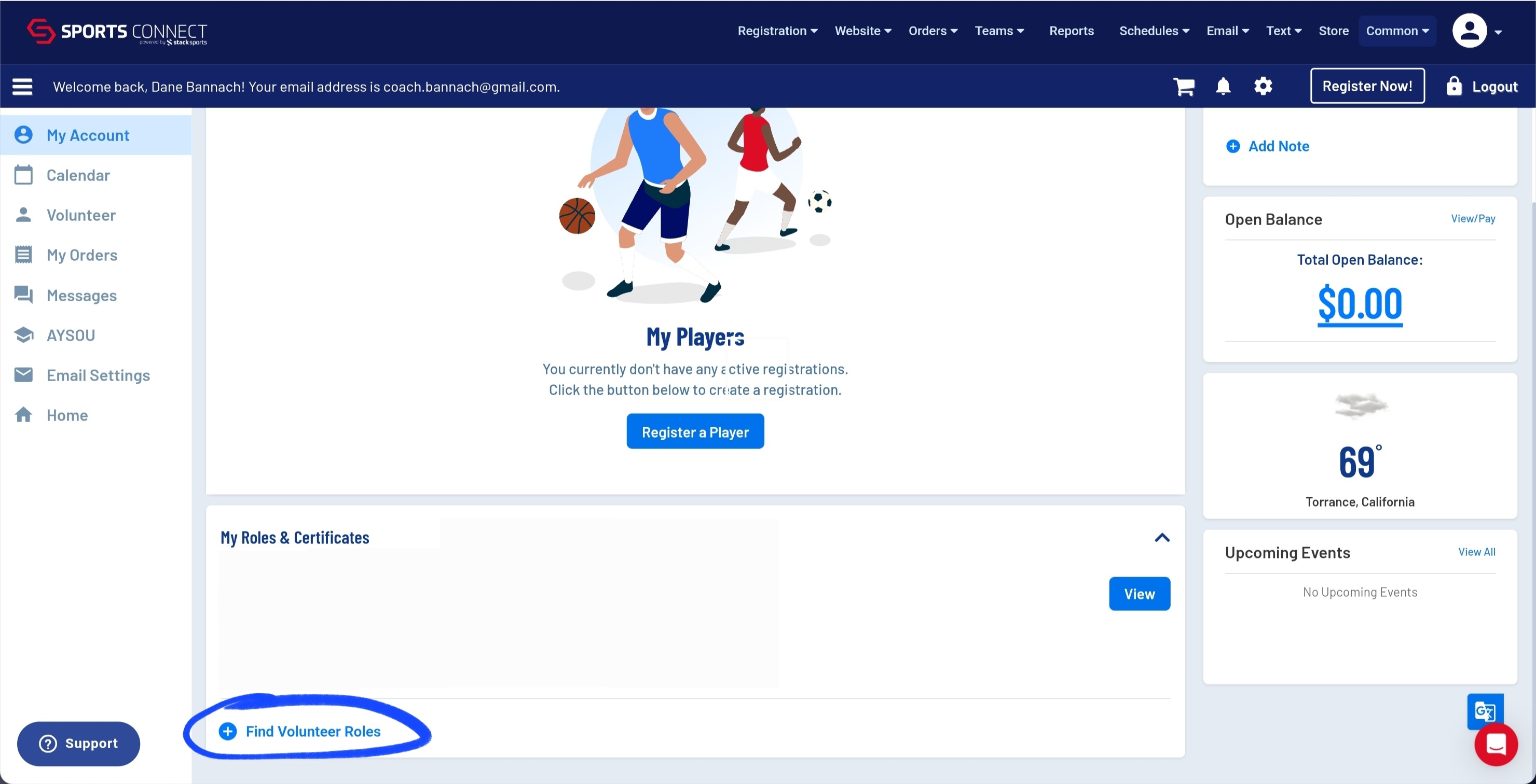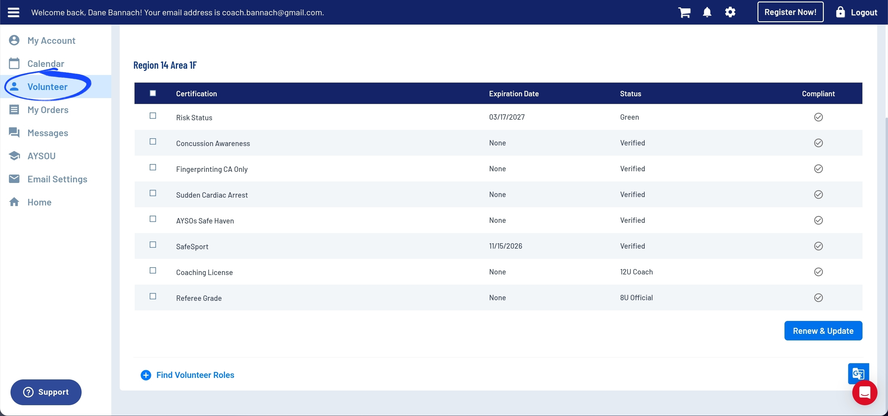 As you begn your AYSO journey, a good rule of thumb for new volunteers is to create a separate AYSO account from the one used to register your children. This will help you avoid running into records management issues later on. To get started, you will want to register as a volunteer for a current team by going to ayso14.org, clicking the REGISTER NOW button on the top right and then scrolling down to the Find Volunteer Roles at the bottom of the page. This will send you to all the active programs in the region. Select the team and then the volunteer role. Once you are registered as a volunteer it will unlock the AYSOU courses you will need to take for the coaching and safety related training.